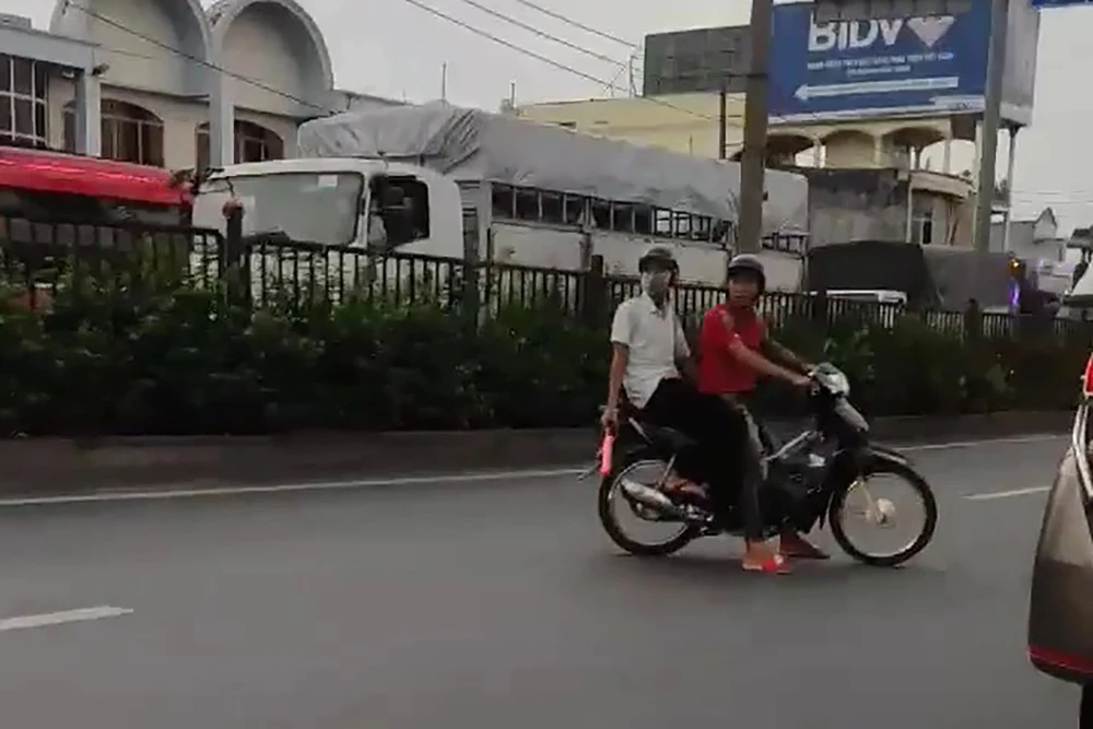 Khoảng 100 xe máy tụ tập đua xe trong làn ô tô ở quốc lộ 22. Ảnh chụp từ clip