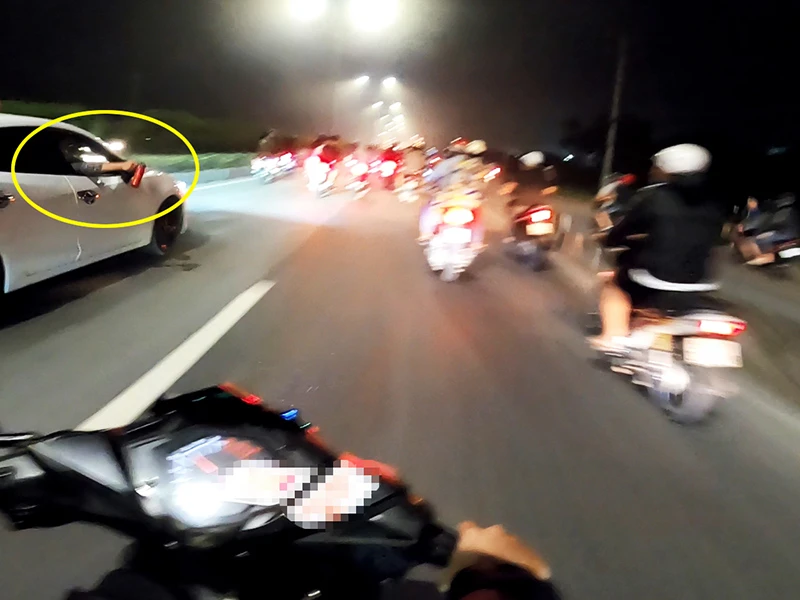 21 giờ, hàng chục “nài” chạy các xe độ chế, che biển số kéo đến điểm hẹn rú ga, nẹt pô inh ỏi. Nhóm này xếp thành hàng dài chờ “xe lớn” đổ về. 15 phút sau, một tài xế xe container chạy ngang qua đưa tay ra ám hiệu, ngay lập tức nhóm này nhanh chóng kéo ga bỏ chạy. Một tay đua cho biết đó là ám hiệu báo có lực lượng CSGT gần đó.