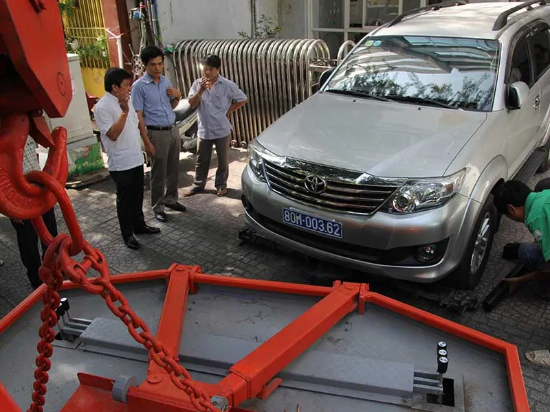 Ông Đoàn Ngọc Hải chỉ đạo niêm phong và cẩu một ô tô biển xanh, một ô tô biển trắng trước Trung tâm Quảng cáo và dịch vụ truyền hình VTV (25C Nguyễn Bỉnh Khiêm, quận 1, TP.HCM). Ảnh: HOÀNG GIANG