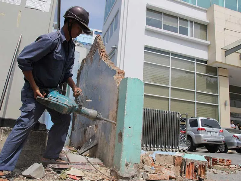Công nhân Công ty Dịch vụ công ích quận 1, TP.HCM đập bỏ bức tường trước tòa nhà Bộ Công Thương - Văn phòng đại diện phía Nam (16 Nguyễn Thị Minh Khai, quận 1, TP.HCM). Ảnh: HOÀNG GIANG
