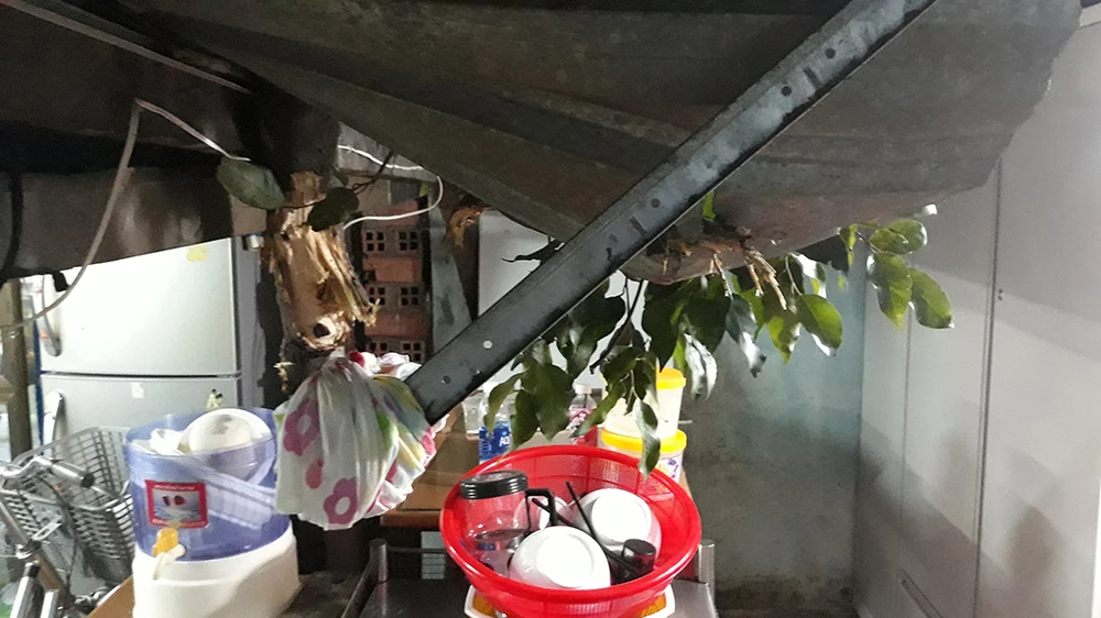 Nhánh cây có đường kính hơn 30 cm rơi xuống ở độ cao lớn đã đè trúng và chắn ngang toàn bộ mái tôn nhà bếp của ông Nguyễn Bá Tạo, trong hẻm đường Lý Văn Phức (phường Tân Định, quận 1).