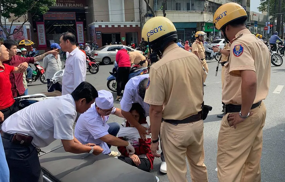 Cú va chạm khiến người phụ nữ ngã xuống đường, gãy xương vai và xây xát. Lúc này, các chiến sĩ CSGT thuộc Đội Bến Thành (Phòng CSGT đường bộ - đường sắt, Công an TP.HCM) đang trên đường làm nhiệm vụ đã phát hiện nên nhanh chóng dừng lại, tiếp cận hiện trường và tình trạng thương tích của nạn nhân.