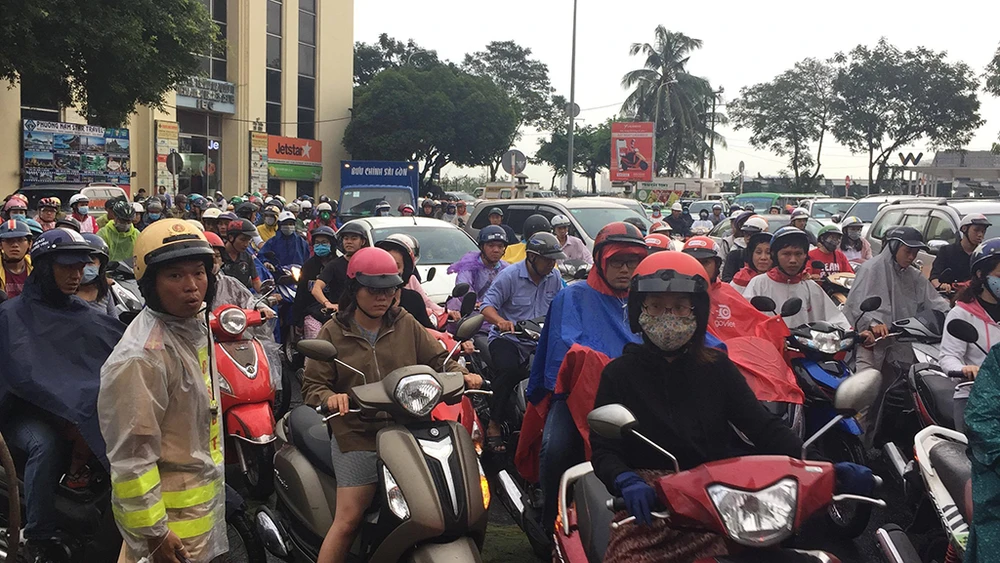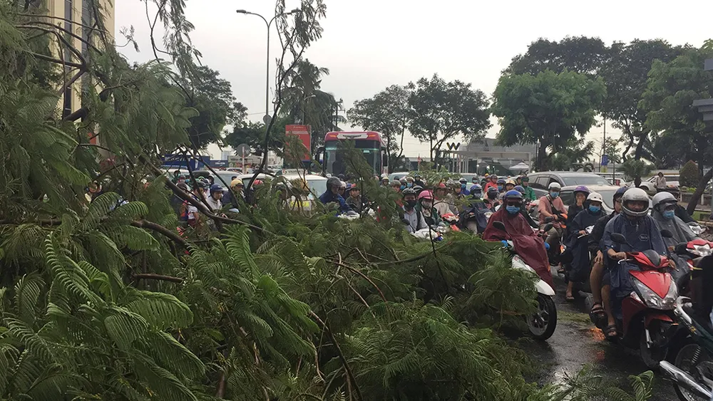 Theo ghi nhận, cây xanh đè trúng hai xe máy và chắn ngang đường, giao thông qua khu vực gặp không ít khó khăn. Hàng ngàn phương tiện ùn ứ kéo dài đến đường Tôn Đức Thắng.
