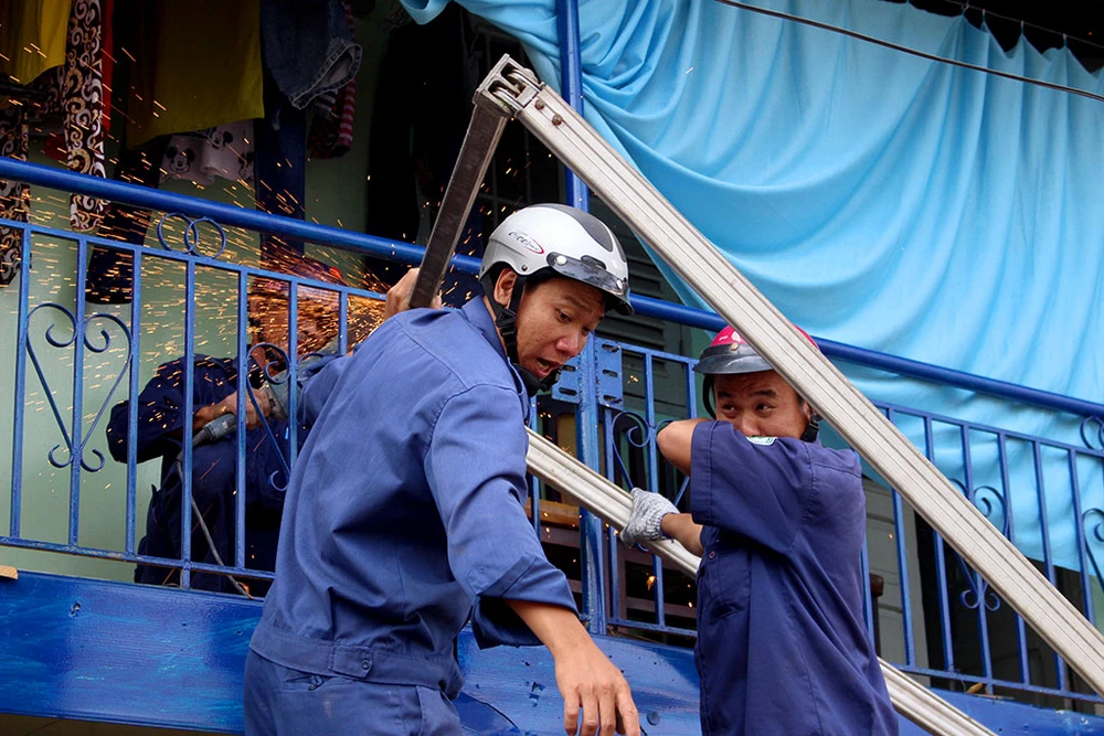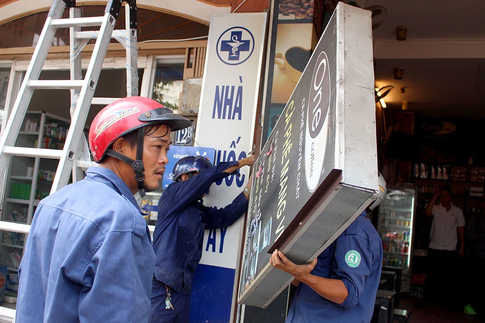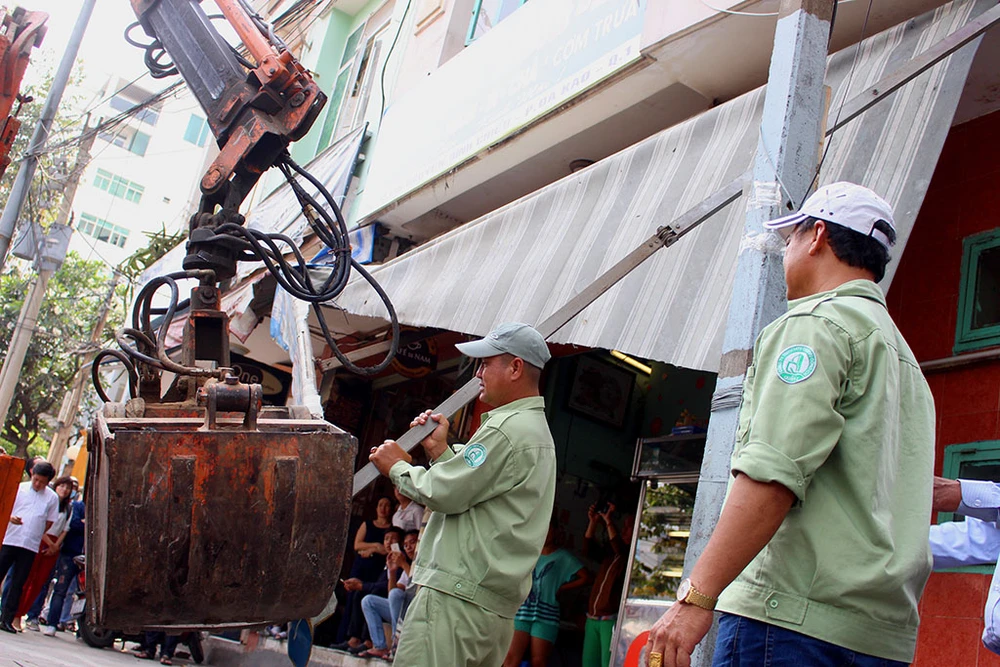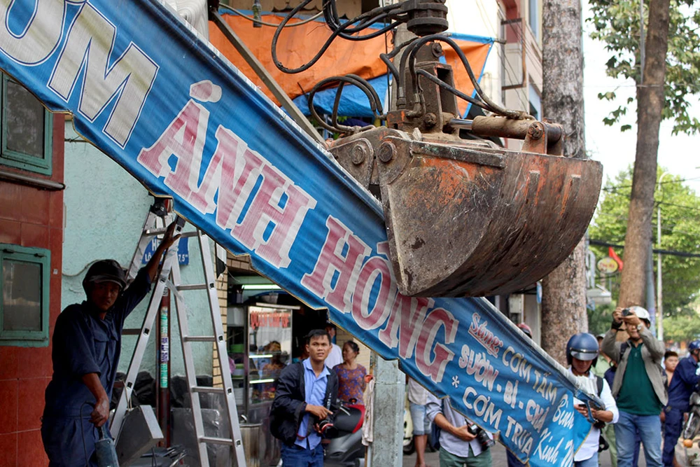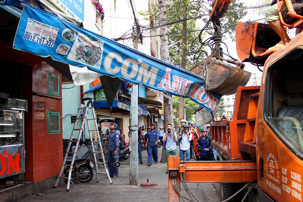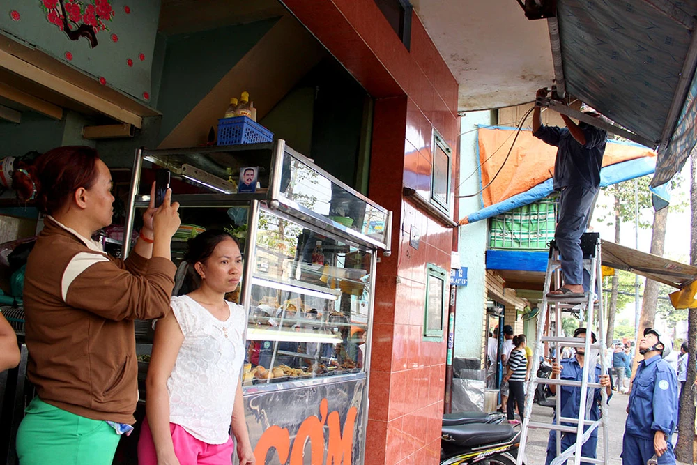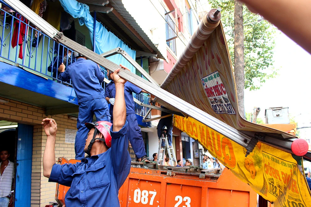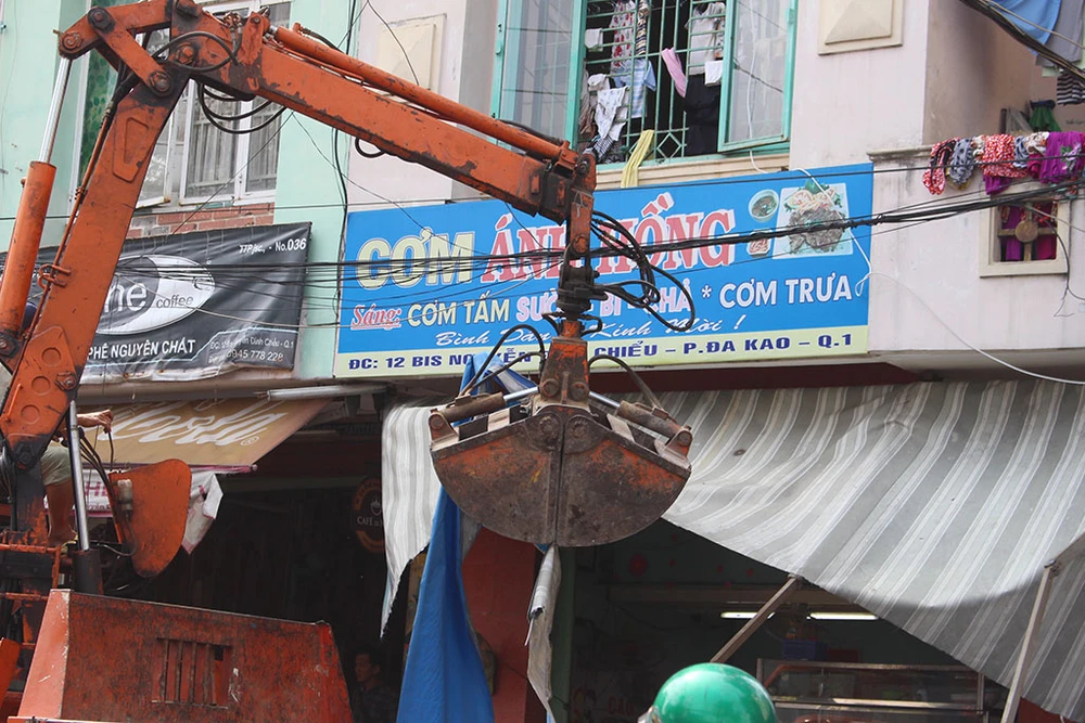 Tại hiện trường, Phó Chủ tịch UBND quận 1 Đoàn Ngọc Hải chỉ đạo tháo gỡ các mái che của nhiều hàng quán vi phạm. Dưới đây là một số hình ảnh do PV Pháp Luật TP.HCM ghi lại.
