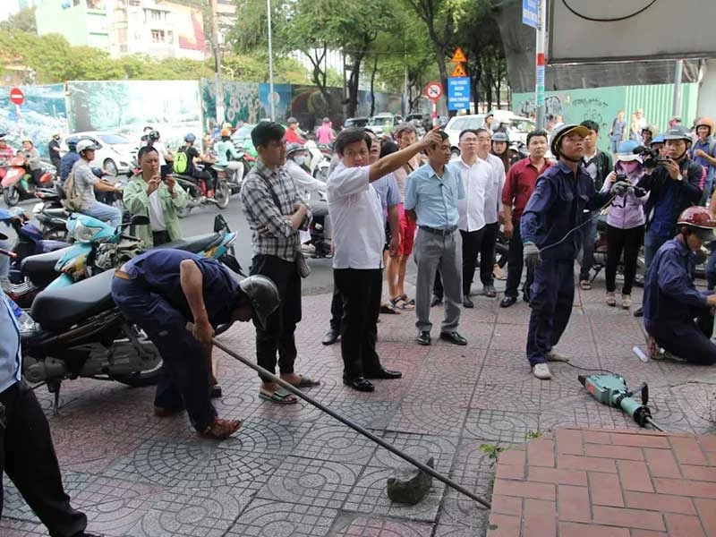 Phó Chủ tịch UBND quận 1 (TP.HCM) Đoàn Ngọc Hải chỉ đạo phá dỡ bậc thềm lấn chiếm vỉa hè trên đường Lê Thánh Tôn. Ảnh: HOÀNG GIANG