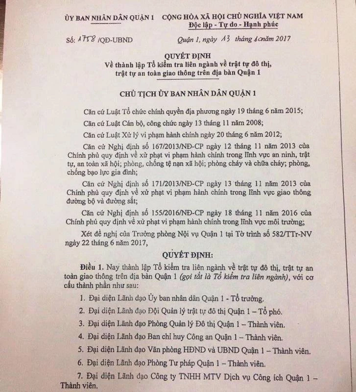 Văn bản nêu rõ nhiệm vụ của tổ liên ngành này là lên phương án, kế hoạch kiểm tra cụ thể trên cơ sở đề xuất của UBND 10 phường; của Tổ kiểm tra công vụ; các địa điểm theo phản ánh của người dân và các cơ quan báo chí, trình Chủ tịch UBND quận 1 phê duyệt.