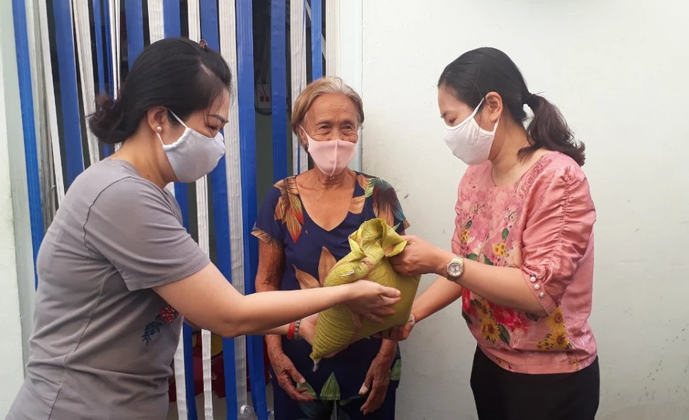Song song với việc kiểm tra tình hình đeo khẩu trang, đảm bảo công tác chống dịch, UBND phường 12, quận 10 cũng thực hiện các hoạt động chăm lo cho người nghèo. ẢNH: TT