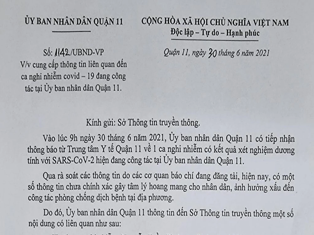 UBND quận 11 vừa có văn bản cung cấp thông tin liên quan đến ca nghi nhiễm COVID-19 là cán bộ hiện đang công tác UBND quận.
