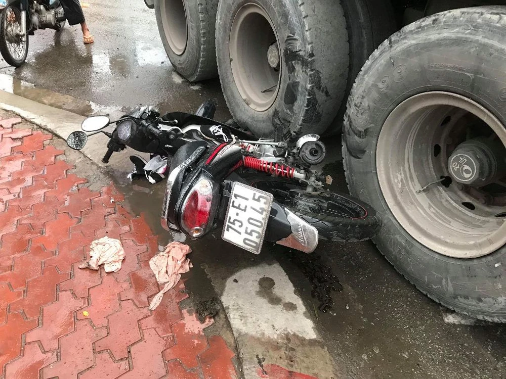 Sự việc khiến phần đầu chiếc 75E1-050.45 bị xe đầu kéo đè lên. Chân chị Hà thì bị cán nát.