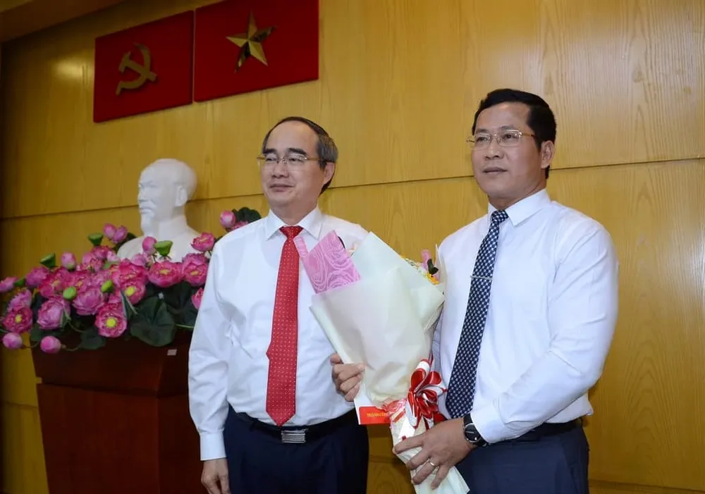 Bí thư Thành ủy TP.HCM Nguyễn Thiện Nhân trao quyết định cho ông Trần Hoàng Danh. Ảnh: PHƯƠNG THÙY