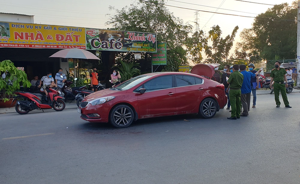 Tại hiện trường, chiếc xe ô tô do người đàn ông điều khiển còn dừng giữa đường. Một bên xe bị móp và có nhiều vết máu; rất đông người dân hiếu kỳ theo dõi.