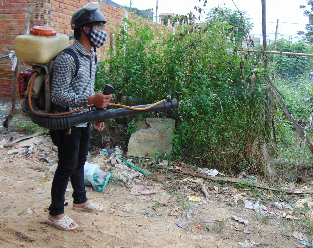 Nhân viên y tế phun thuốc diệt muỗi trên địa bàn khu phố 7, phường Hiệp Thành, quận 12 (TP.HCM). Ảnh: TRẦN NGỌC