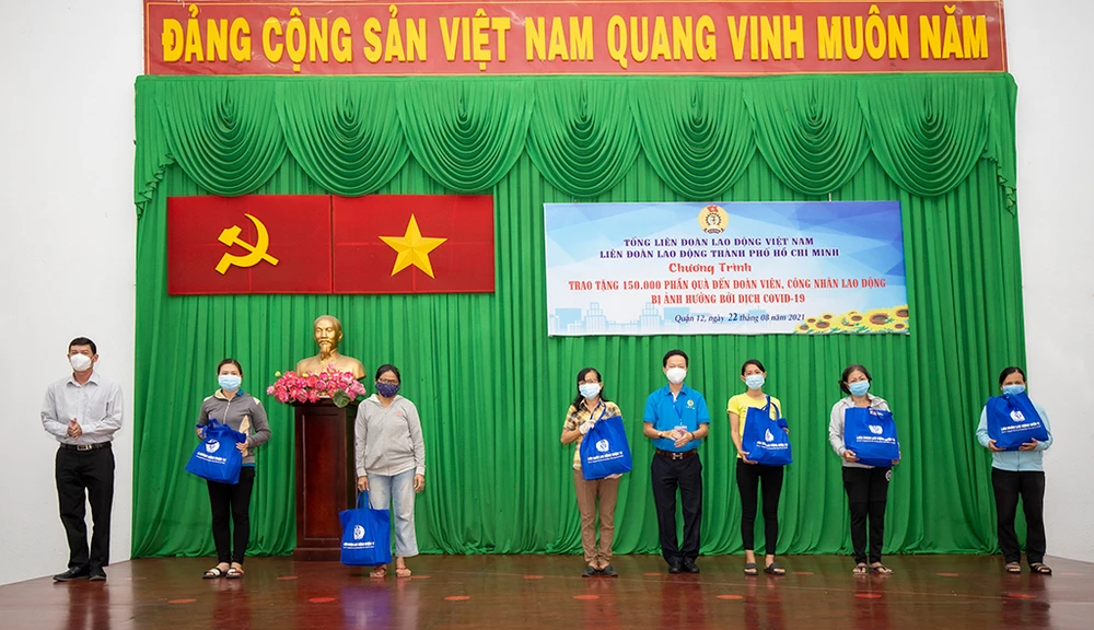 Ngày 22-8, Liên đoàn Lao động TP.HCM tổ chức chương trình trao tặng 150.000 phần quà gửi đến đoàn viên, công nhân lao động khó khăn bị ảnh huởng dịch bệnh COVID-19 của Tổng Liên đoàn Lao động Việt Nam tại quận 12, TP.HCM.