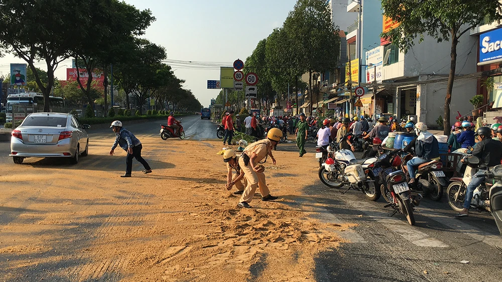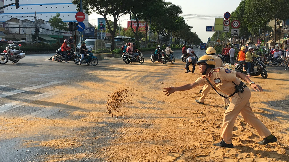 Cảnh sát giao thông huy động xe chở cát khắc phục sự cố. Ảnh NT.