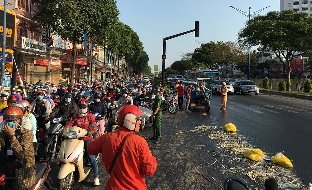 Theo quan sát, hóa chất dạng lỏng màu trắng rất trơn trượt. Giao thông vào giờ cao điểm khiến khu vực ùn ứ nghiêm trọng.