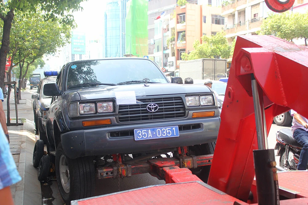 Một xe ô tô biển xanh khác đậu dưới lòng đường cũng bị niêm phong và cẩu đi. Ảnh: T. TÚ
