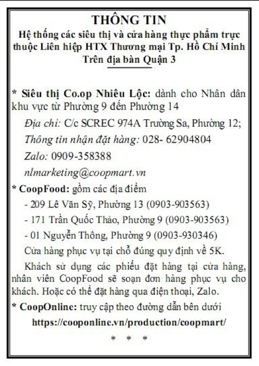 | Đi siêu thị giúp người dân Bà Hằng cho biết, ngoài phát phiếu mua hàng, hướng dẫn người dân mua hàng qua app,… quận 3 đang triển khai hình thức đi siêu thị giúp người dân. Cụ thể, các phường sẽ thành lập các tổ nhóm phụ trách theo khu phố, tổ dân phố, tiếp nhận thông tin đặt hàng tại Co.opmart của người dân. Sau đó tổng hợp và chuyển đến siêu thị để siêu thị soạn hàng và giao về cho phường chuyển cho người dân theo đơn hàng đã đăng ký. Việc làm này sẽ được thực hiện đối với các gia đình không có điều kiện đi siêu thị hoặc không muốn đến nơi tiếp xúc đông người và không thể đặt hàng qua online của siêu thị Co.opmart do quá tải. Đặc biệt là ở các khu vực phong toả, cách ly y tế. |