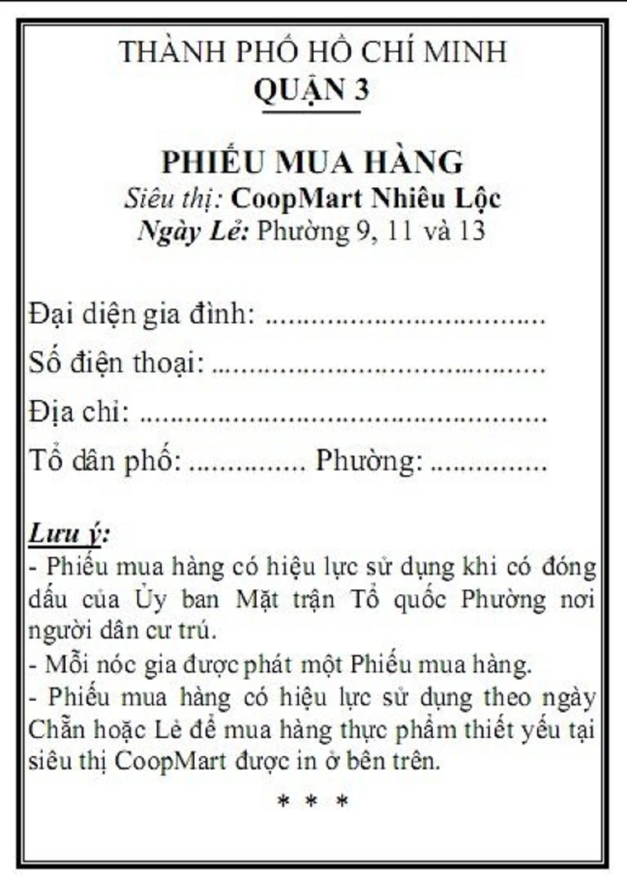 Phiếu mua hàng có hiệu lực sử dụng khi có đóng dấu của UBMTTQ phường nơi người dân cư trú. Mỗi nhà được phát một phiếu mua hàng.