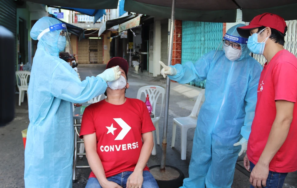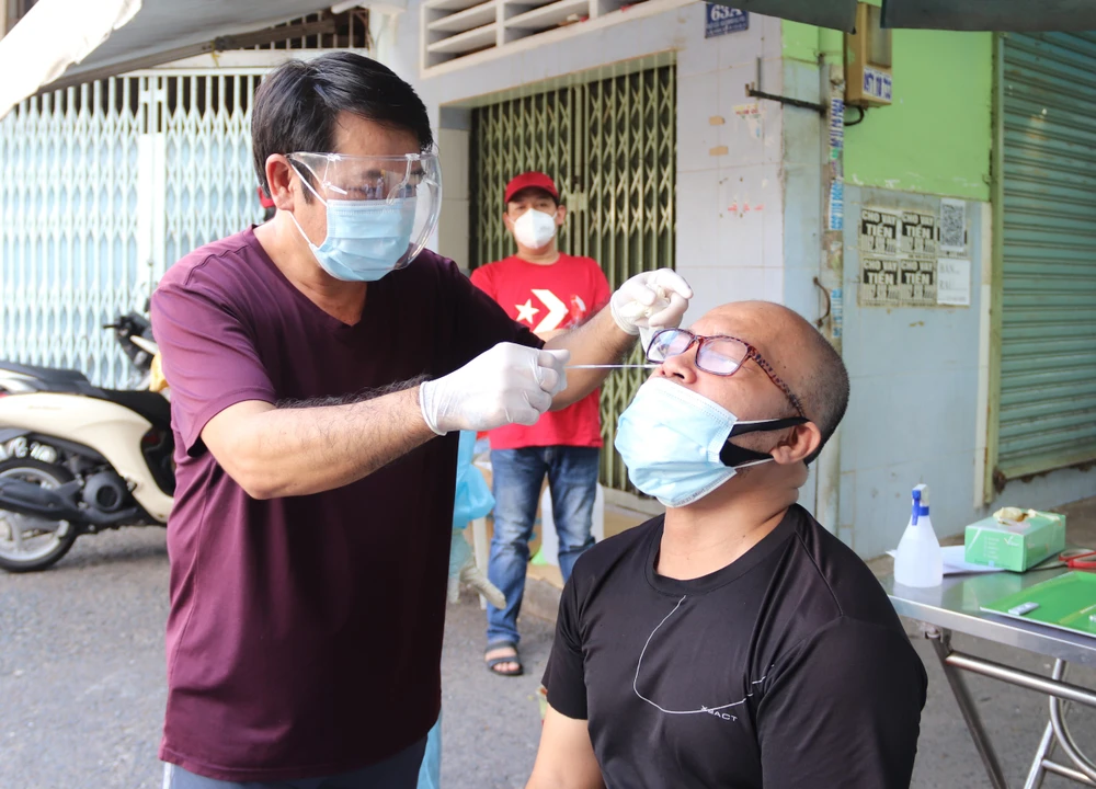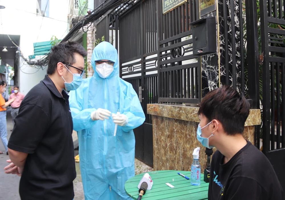 Tại hẻm 456 Lê Văn Sĩ, phường 14, quận 3, nhân viên xét nghiệm đã tận tình hướng dẫn một người tự thực hiện test nhanh cho chính hộ gia đình của mình.