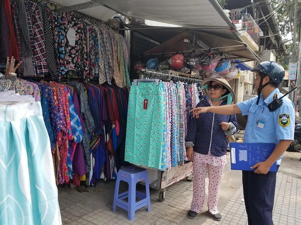 Lực lượng Cảnh sát trật tự cùng Quản lý trật tự đô thị quận 3 nhắc nhở hộ buôn bán lấn chiếm lề đường.