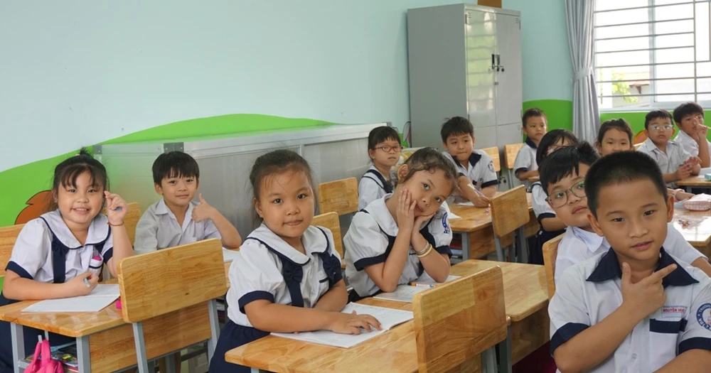 Học sinh hân hoan khi được học trong ngôi trường mới với đầy đủ tiện nghi.