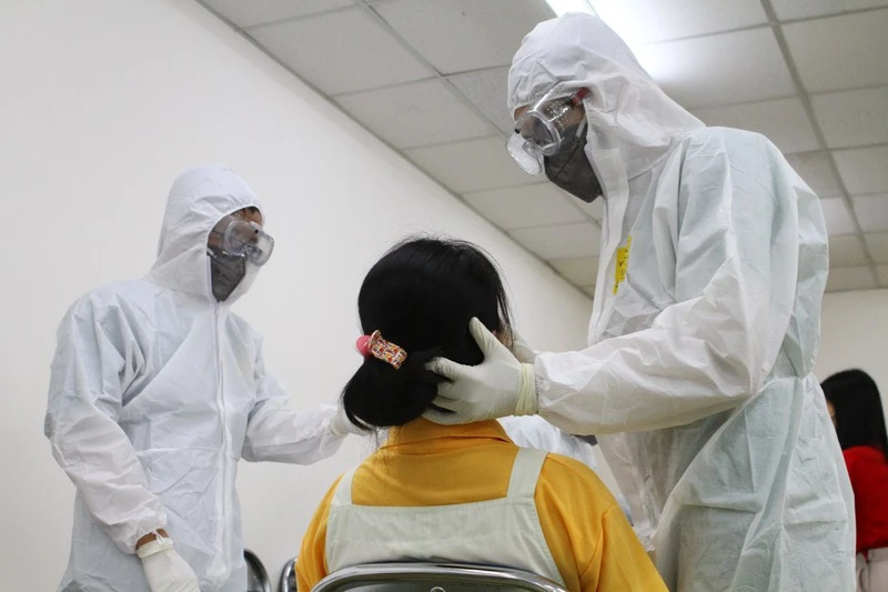 Lấy mẫu xét nghiệm cho công nhân tại Khu chế xuất Tân Thuận. Ảnh: MINH TÂM