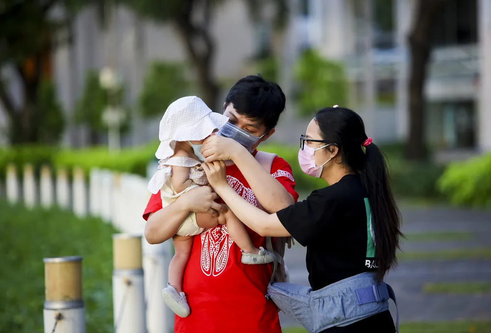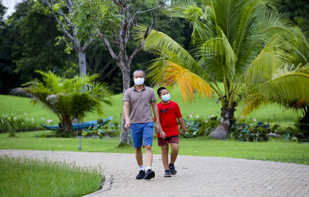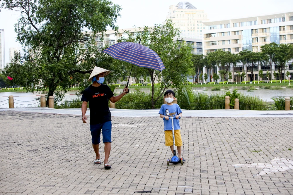 Chị Lê Thị Diễm Trinh (Cư dân khu đô thị Phú Mỹ Hưng) cùng gia đình dạo mát quanh khu vực công viên. "Khi được phép ra ngoài, cả nhà tôi rất vui. Sau nhiều tháng chỉ ở nhà, chúng tôi đã có thể cho con ra ngắm cảnh, hít thở khí trời, con tôi rất thích thú." - Chị Trinh chia sẻ.