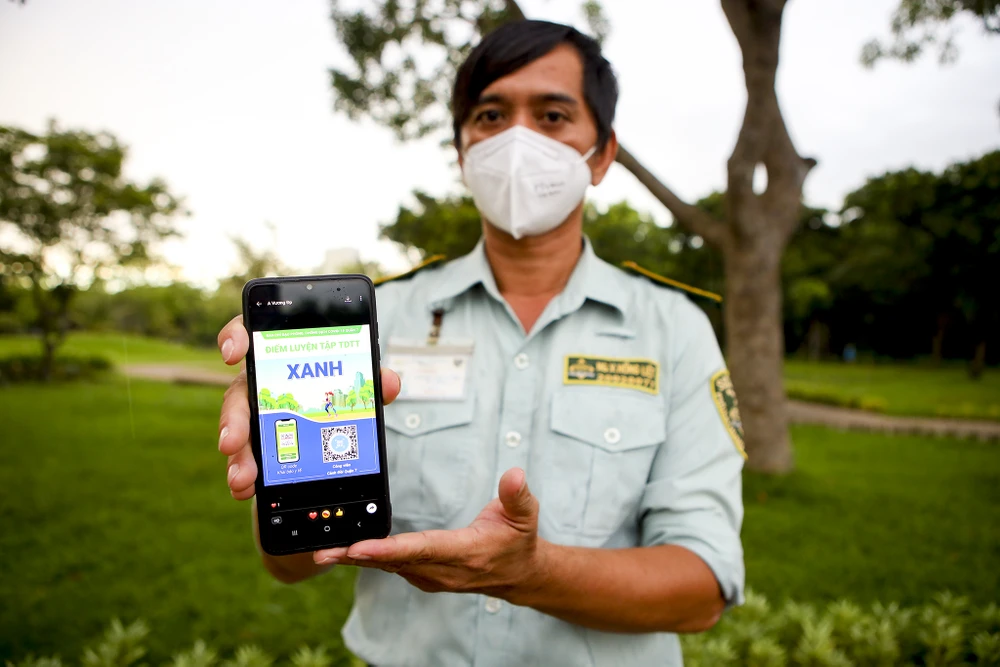 Trước khi vào tập luyện, người dân phải quét mã khai váo y tế. Hơn 20 nhân viên của điểm tập luyện sẽ quản lý, nhắc nhở người dân tuân thủ 5K.