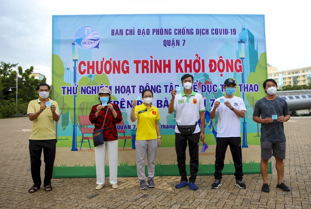 Chiều nay (21-9), UBND quận 7 làm lễ khởi động thí điểm mở cửa các điểm luyện tập thể dục thể thao trên địa bàn quận. Theo đó, vào lúc 17 giờ, UBND phường Tân Phong phát "thẻ đủ điều kiện tập thể dục" cho khoảng 20 người để chạy bộ, đạp xe, đi dạo tại công viên Cảnh Đồi.