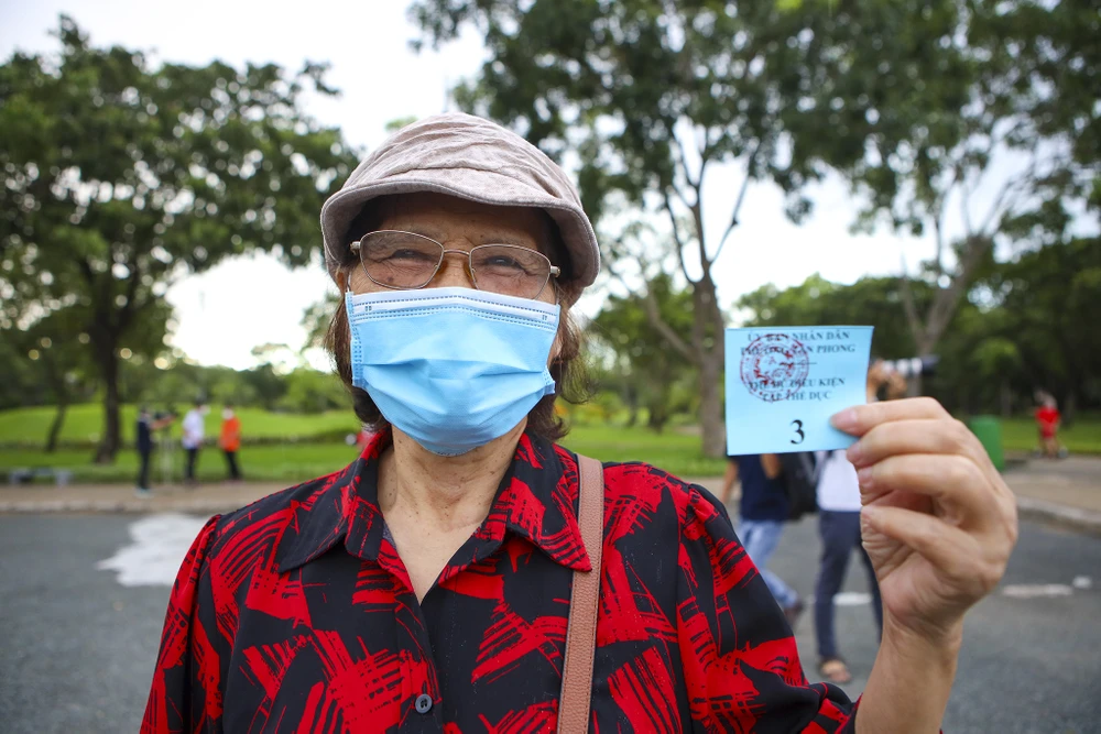 Các công viên và điểm tập luyện thể thao ưu tiên cho người trên 50 tuổi. "Mấy tháng nay chấp hành chỉ thị 16, không thể ra đường, nó là một sự bức bách hết sức khó khăn với người già như tôi. Được biết, phường cho mở lại công viên tôi liền đăng ký ngay để đi tập thể dục.Tôi rất háo hức khi được ra khỏi nhà, được vận động trở lại." - Bà Nguyễn Thị Thanh (79 tuổi, phường Tân Phong) chia sẻ.