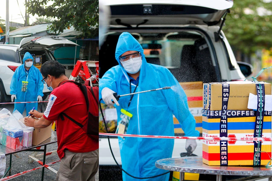 Việc xử lý sát khuẩn hàng hóa, nhu yếu phẩm vận chuyển vào bên trong khu vực phong tỏa cũng được xử lý theo quy trình. Chị Vân Trang, đội phản ứng nhanh chung cư Ehome 3, cho biết chung cư có khoảng 200 hộ dân. Hằng ngày đội phối hợp với lực lượng chức năng ở chốt Phú Định vận chuyển hàng hóa, nhu yếu phẩm để người dân yên tâm thực hiện cách ly.