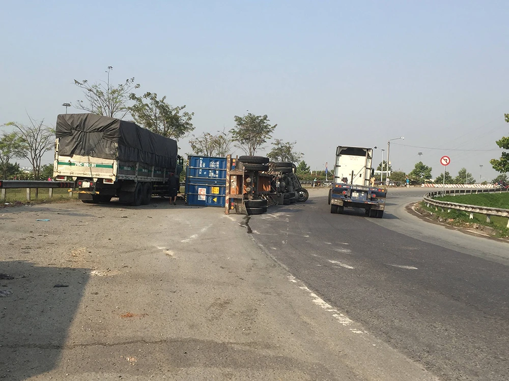 Chiếc container bất ngờ lật nghiêng, xuýt đè trúng xe tải chạy cùng chiều. Ảnh: H.Tâm