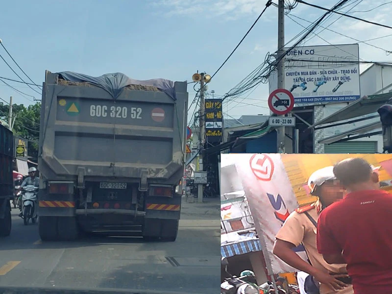 Xe ben chở cát chạy trên đường Nguyễn Xiển vào giờ cấm ngày 14-7. Ảnh nhỏ:“Cò” Lộc trao đổi với CSGT. Ảnh: T.SANG