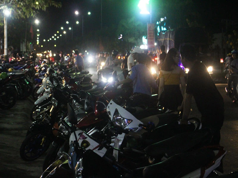 Vào khoảng 21 giờ đêm 30 Tết, lượng thực khách đến quán Làng Chài trên đường Đồng Văn Cống, TP Bến Tre tấp nập. Do bãi đậu xe trên lề đường của quán chật kín chỗ nên nhân viên của quán này đã ngang nhiên chiếm dụng một đoạn lòng đường Đồng Văn Cống dài khoảng 150m làm bãi đậu xe cho hàng loạt xe máy.