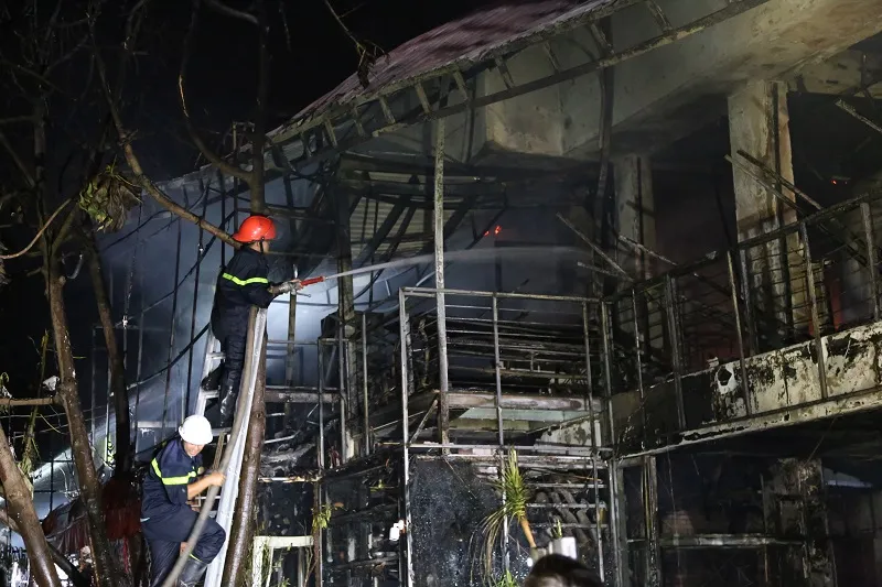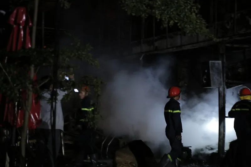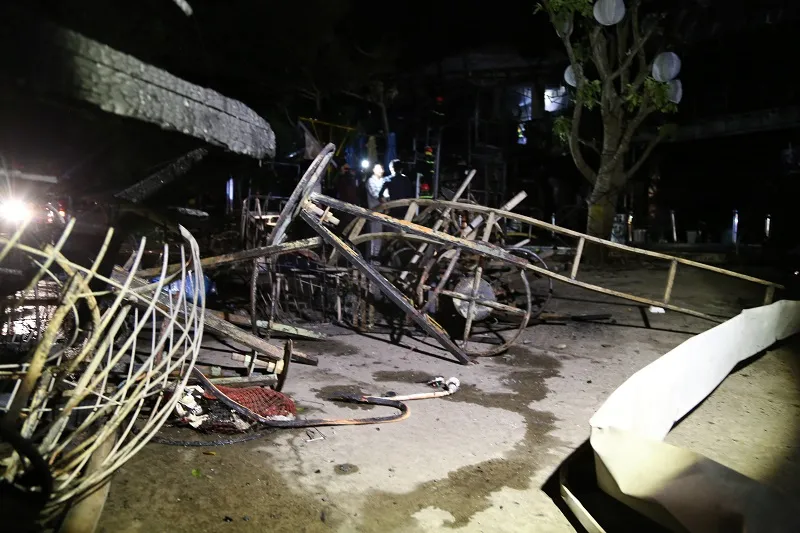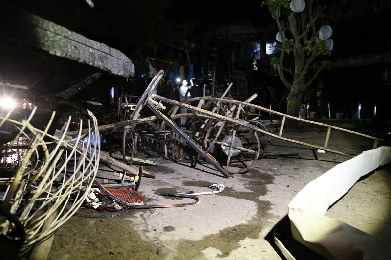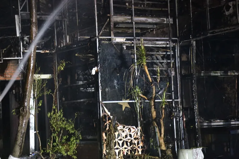 Theo ghi nhận của PLO, hầu hết các vật dụng đều bị thiêu rụi, quán chỉ còn trơ khung. Nhiều bình gas và các vật dụng được cảnh sát đưa ra ngoài. Cùng với đó, nhiều xe tiếp nước vẫn liên tiếp đến để cứu hỏa.