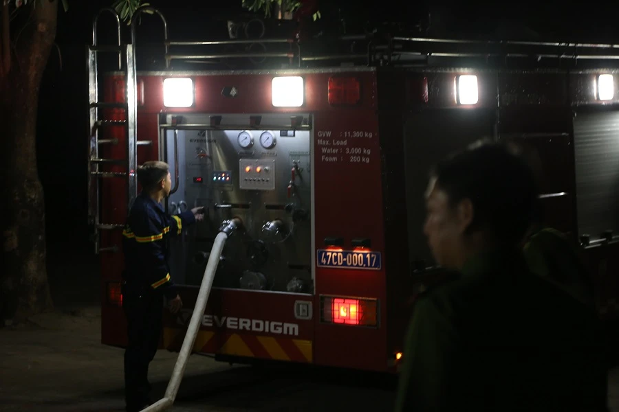 Đến hơn 0 giờ, việc dập lửa vẫn đang được khẩn trương tiến hành. Nhiều phương tiện chữa cháy được điều đến hiện trường.
