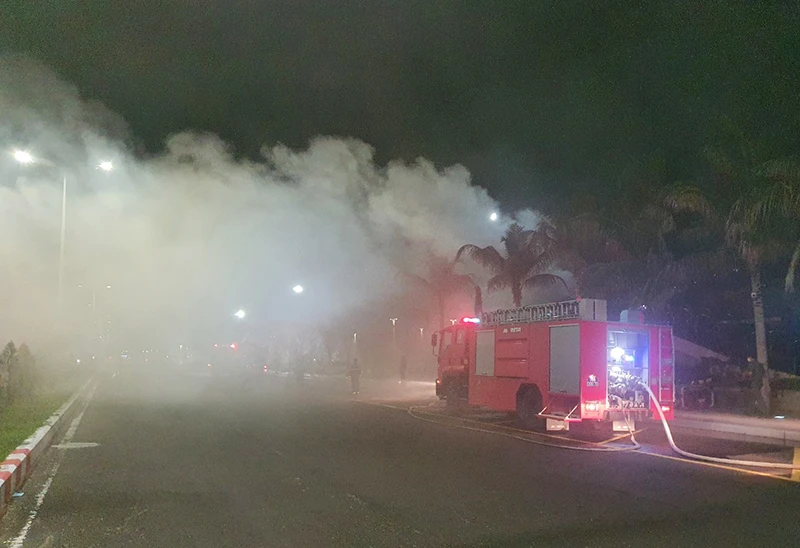 Đến sáng 23-5, xe chữa cháy chuyên dụng vẫn còn làm nhiệm vụ tại đám cháy quán bar Sands Bay Club. Ảnh: MINH KHÔI