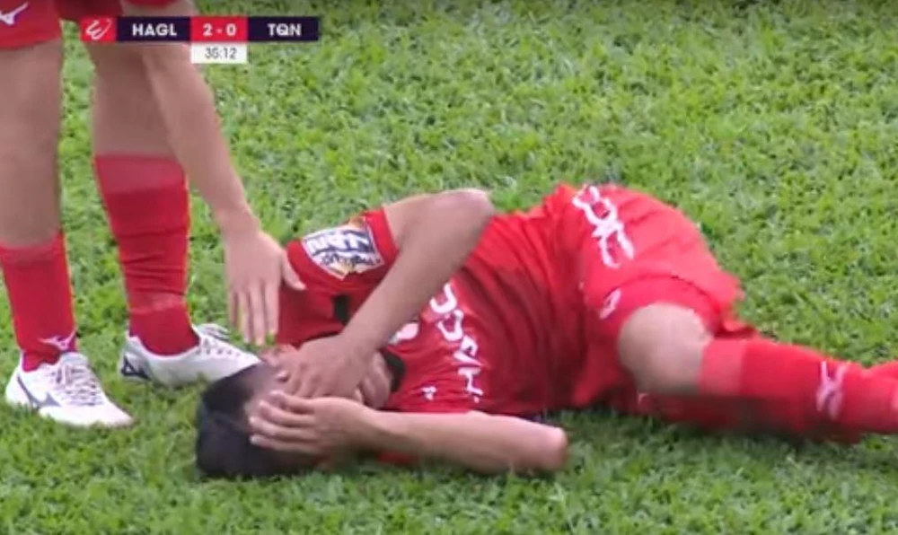 Tiền vệ Triệu Việt Hưng đau đớn nằm ôm mắt trên sân Pleiku.