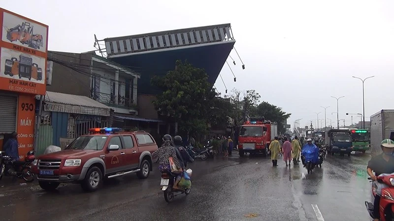 Biển quảng cáo khủng gãy, "đè" lên nhiều nhà khiến một người chết, một người bị thương. Ảnh: HT