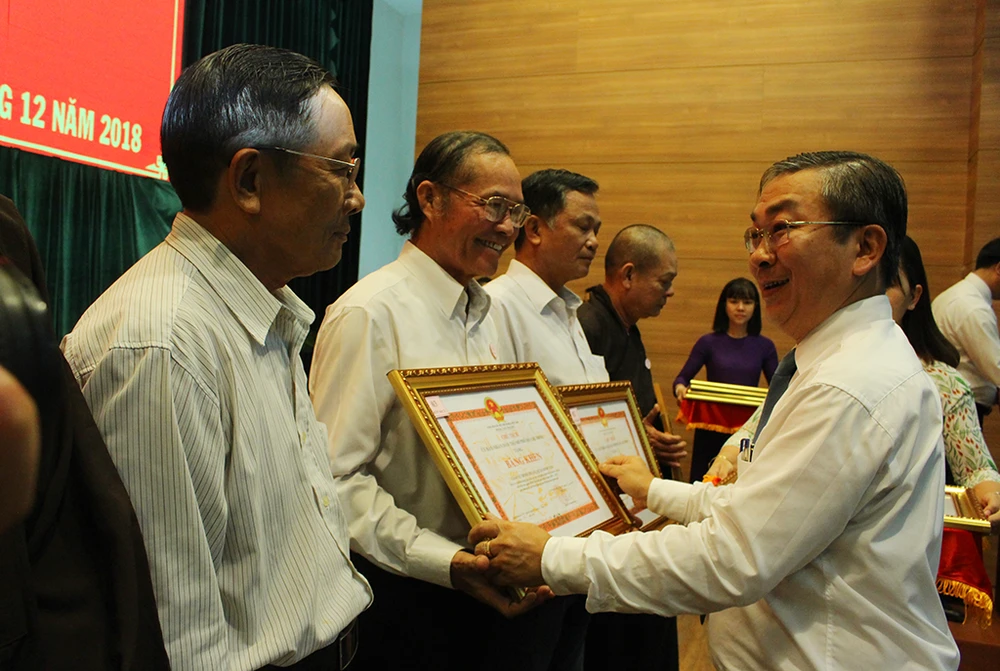 Ông Võ Ngọc Quốc Thuận, Bí thư Quận ủy quận Bình Tân, trao bằng khen của UBND TP cho các tập thể và cá nhân có thành tích xuất sắc. Ảnh: L. THOA