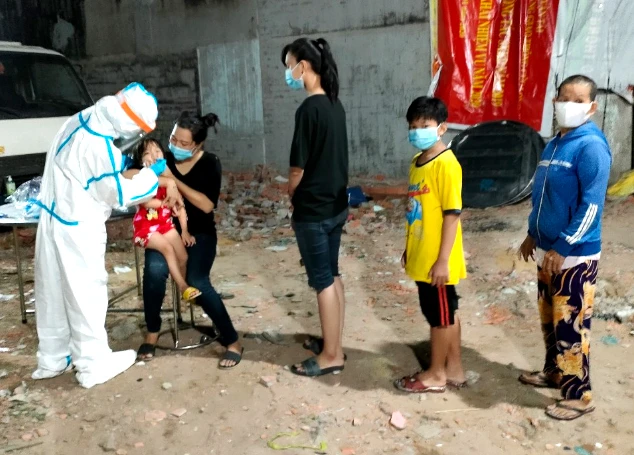 Nhân viên y tế lấy mẫu xét nghiệm người dân trong khu vực phong tỏa ở phường Bình Hưng Hòa B, quận Bình Tân. Ảnh: NGUYỄN THỨC