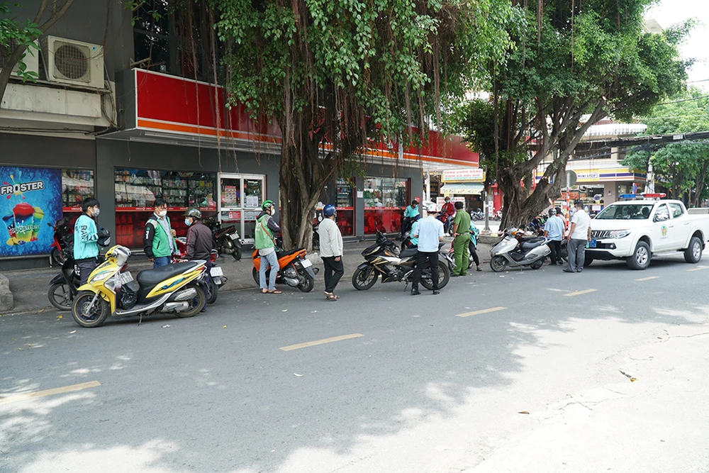 Lực lượng chức năng phường 25, quận Bình Thạnh kiểm tra các tài xế công nghệ tụ tập trên đường Võ Oanh. Ảnh: ĐC
