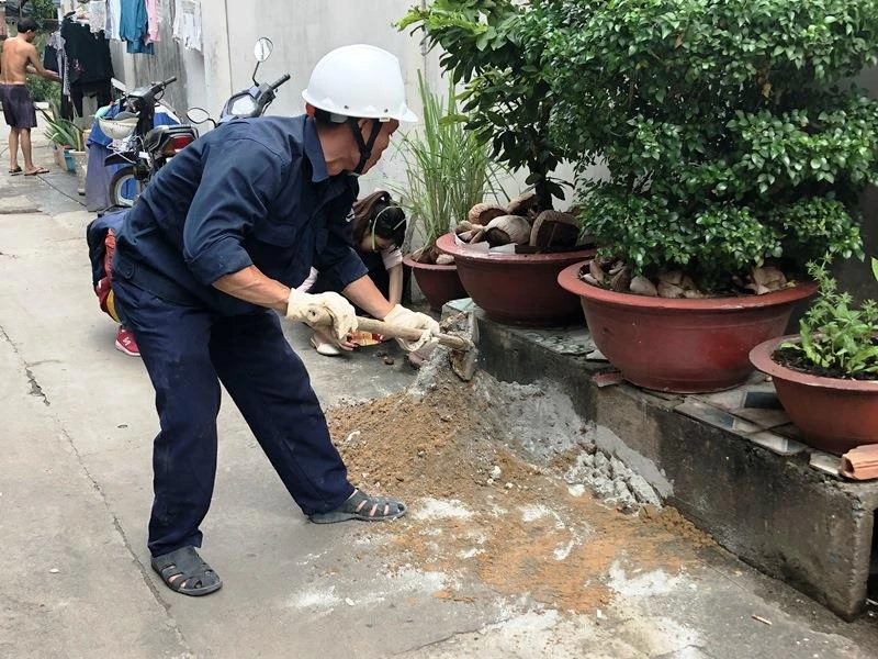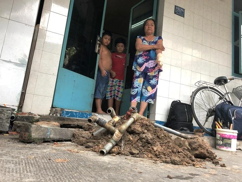Sáng 2-7, bà Lê Xuân Hiệp ở đường Lê Quang Định, phường 11, quận Bình Thạnh hồ hởi đón đoàn thi công trám lấp giếng ngầm vào nhà. Bà Hiệp cho biết bà đã sử dụng giếng ngầm hơn 30 năm nay mặc dù vẫn sử dụng song song nguồn nước sạch.