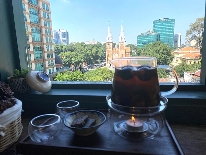 Từ ba khung cửa sổ, khách uống cà phê có thể thưởng thức Sài Gòn với nhiều sắc thái khác nhau. Một khung là hình ảnh Sài Gòn xưa cũ trong ký ức với nhà thờ Đức Bà và tòa nhà Bưu điện TP yên bình. Khung cửa số kế bên lại mang một sắc thái hoàn toàn khác, vẫn ôm trọn nhà thờ Đức Bà song không khí lại tấp nập hơn bởi trước mặt là con đường Đồng Khởi đông người qua lại. Khung cửa sổ cuối cùng mang đến cho bạn duy nhất một nhà thờ Đức Bà với thiết kế kiến trúc độc đáo, mang ý nghĩa lịch sử và tôn giáo sâu sắc.