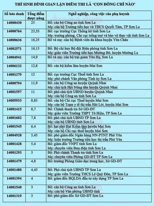 Liên quan đến những trường hợp thí sinh được nâng điểm thi ở Sơn La, trong số 44 thí sinh được nâng điểm phần lớn đều là con, cháu của những lãnh đạo có chức vụ ở địa phương, thậm chí cả lãnh đạo trong ngành công an, Sở GD&ĐT tỉnh Sơn La…