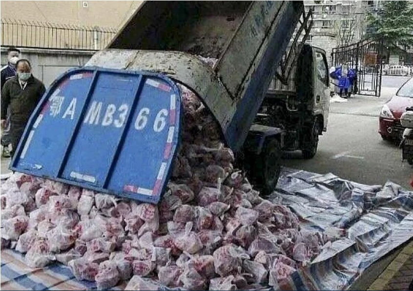Theo báo South China Morning Post, cư dân khu Viên Lâm, quận Thanh Sơn, Vũ Hán đã phẫn nộ đã khi thịt heo mà họ mua từ các cửa hàng do chính phủ phân phối được đem đến trong xe chở rác.