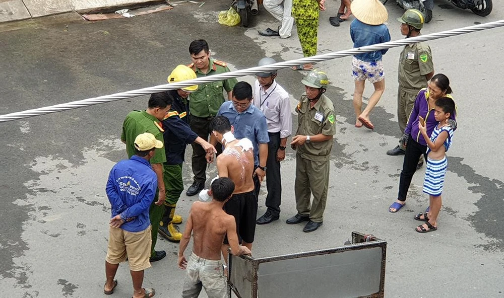 Lúc này, chủ quán cơm với nhiều vết thương tháo chạy ra ngoài kêu cứu. Ông này cho hay vợ con ông cùng chủ nhà đang mắc kẹt bên trong.