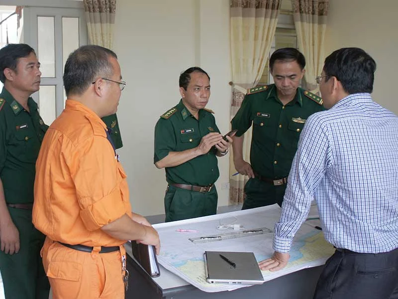 Sở chỉ huy tiền phương quan sát trên bản đồ bàn phương án tìm kiếm thuyền viên đang mất tích. Ảnh: ĐẮC LAM