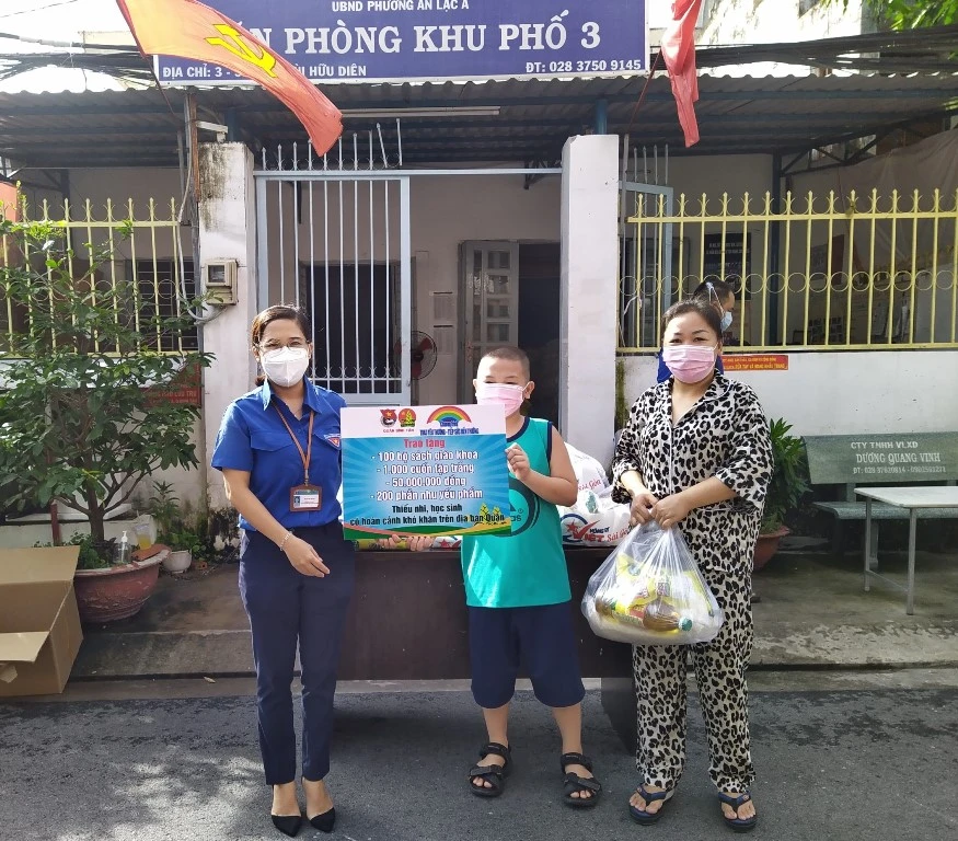 Theo đó quận đã thành lập năm Đoàn đến thăm và trao tặng 100 bộ sách giáo khoa, 100 quyển tập trắng và kinh phí 50.000.000 đồng cho 100 em thiếu nhi tại các khu lưu trú, nhà trọ thanh niên công nhân trên địa bàn phường An Lạc A, Bình Trị Đông, Bình Trị Đông A và Bình Hưng Hòa A. Các em thiếu nhi nhận tập sách và tiền hỗ trợ đa phần là con em thuộc gia đình khó khăn, bị mắc COVID-19 hoặc mồ côi bởi đại dịch COVID-19” – chị Huyền chia sẻ.