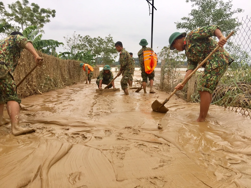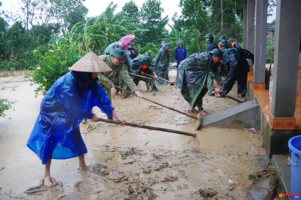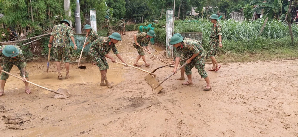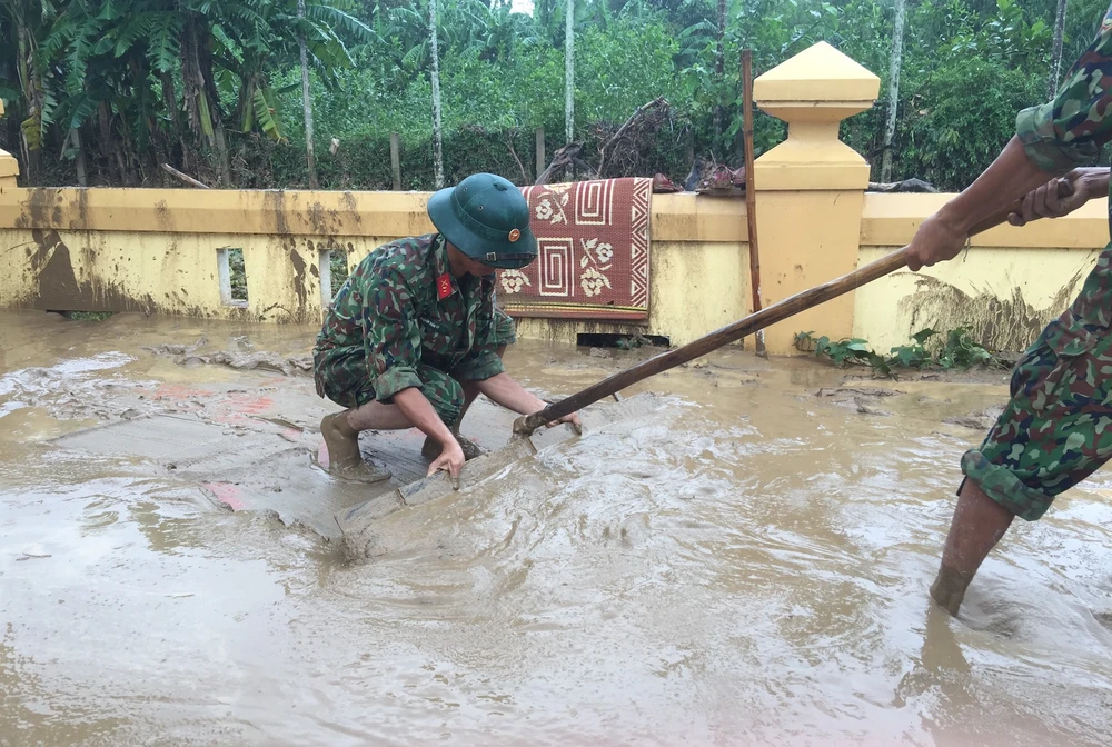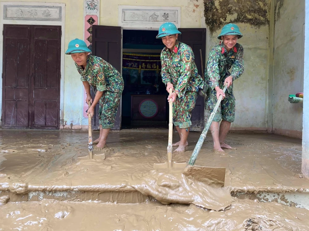 Mỗi ngày Trung đoàn 19, Sư đoàn 968 huy động 500 cán bộ chiến sĩ đi giúp dân dọn nhà, làm sạch đường xá để người dân ổn định cuộc sống sau lũ.